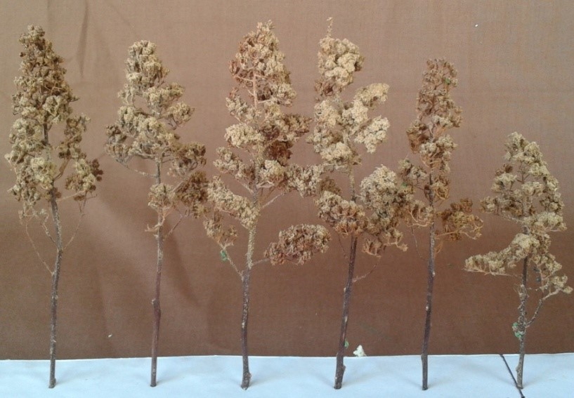 Trees made of natural materials Weeds - These are great because if they grow nearby, they're free. All you have to do is go and pick them. Look around your neighborhood and see what's there. The best time to harvest is in the fall because most die and dry up as winter approaches. Don't bother with green weeds. They will dry up after you pick them and will look completely different. The varieties are often different in different parts of the country. Some of these from the northeast include: wild oregano, hardhacket, meadowsweet and sumac. The first three represent deciduous trees. (Leaf type trees that lose their leaves in the winter time.) Sumac mimics a conifer (Evergreens, or cone bearing trees). Peppergrass makes great deciduous trees and can be found in some of the mountain states along with sagebrush which makes great armatures for large foreground leaf trees. Pepper grass found in Rockies can be used for back ground trees or made into detailed for foreground trees ground trees.