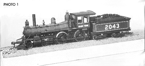The first model is a GTR 4-4-0, No. 2043. This is built from an AHM Genoa. The chassis and drive are pretty much the way they came from AHM, but the boiler, cab and tender body, as well as most of the details, are scratchbuilt or extensively modified using styrene. Remember, I said I couldn't solder two weeks together. I entered this engine under "crosskit" category.
